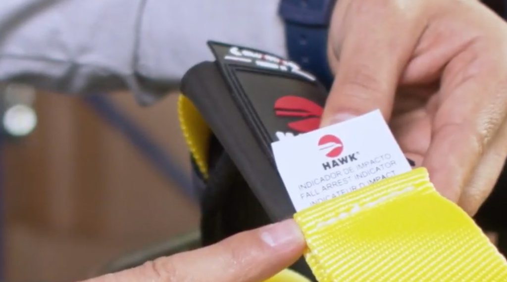 Para probar el indicador de impacto fuimos al laboratorio a hacer una prueba dinámica en la torre de pruebas. Le pusimos el arnés 412T a un maquiní reglamentario ANSI de 100 kgs, lo subimos a una altura de 4 metros; y desde ahí lo soltamos para que sufriera una caída libre de 62 centímetros. Ello produjo una energía de impacto de 4.5 kN. El indicador de impacto se activó aproximadamente al recibir los 2 kN de impacto; es decir, mucho antes de que la caída terminara.